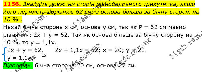 Знайдіть довжини сторін рівнобедреного трикутника, якщо його периметр дорівнює 62 см, а основа більша за бічну стороні на 10 % . Нехай бічна сторона х см, основа у см, так як P = 62 см маємо рівняння: 2х + у = 62. Так як основа більше за бічну сторону на 10 %, то у = 1,1х. 2х + у = 62, 2х + 1,1х = 62; х = 20; у = 22. у = 1,1х; Відповідь: бічна сторона 20 см, основа 22 см.