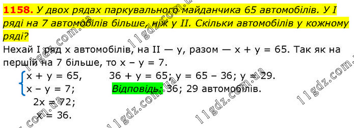 У двох рядах паркувального майданчика 65 автомобiлiв. У I рядi на 7 автомобiлiв бiльше, нiж у II. Скiльки автомобiлiв у кожному рядi? Нехай І ряд х автомобілів, на II — у, разом — х + у = 65. Так як на першій на 7 більше, то х – у = 7.
