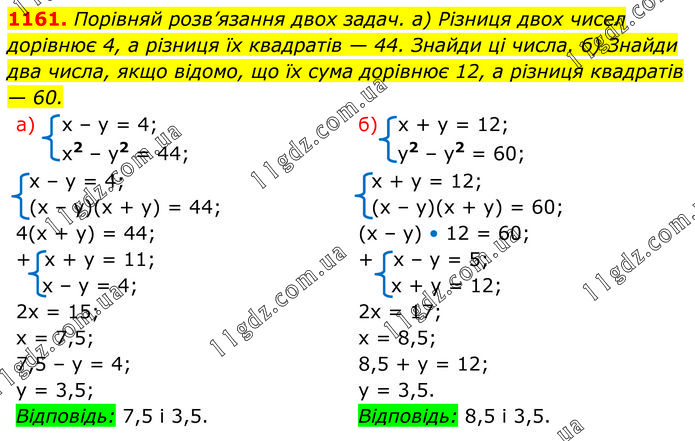 Порівняй розв’язання двох задач. а) Різниця двох чисел дорівнює 4, а різниця їх квадратів — 44. Знайди ці числа. б) Знайди два числа, якщо відомо, що їх сума дорівнює 12, а різниця квадратів — 60.