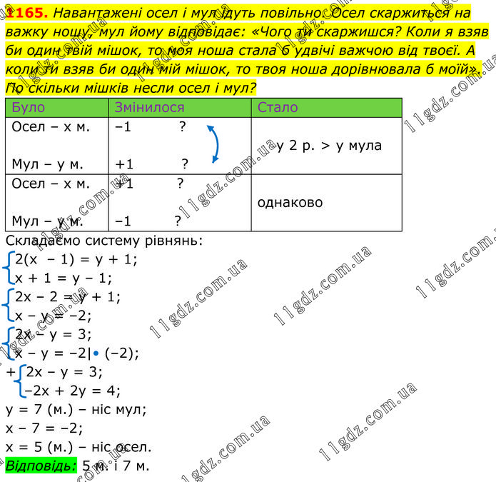 Навантажені осел і мул ідуть повільно. Осел скаржиться на важку ношу, мул йому відповідає: «Чого ти скаржишся? Коли я взяв би один твій мішок, то моя ноша стала б удвічі важчою від твоєї. А коли ти взяв би один мій мішок, то твоя ноша дорівнювала б моїй». По скільки мішків несли осел і мул?