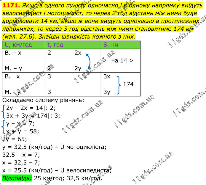 Якщо з одного пункту одночасно і в одному напрямку виїдуть велосипедист і мотоцикліст, то через 2 год відстань між ними буде дорівнювати 14 км. Якщо ж вони виїдуть одночасно в протилежних напрямках, то через 3 год відстань між ними становитиме 174 км (мал. 27.6). Знайди швидкість кожного з них. Складаємо систему рівнянь: 2у – 2х = 14|: 2; 3x + 3y = 174|: 3; y – x = 7; x + y = 58; 2y = 65; y = 32,5 (км/год) – U мотоцикліста; 32,5 – х = 7; х = 32,5 – 7; х = 25,5 (км/год) – U велосипедиста; Відповідь: 25 км/год; 32,5 км/год.