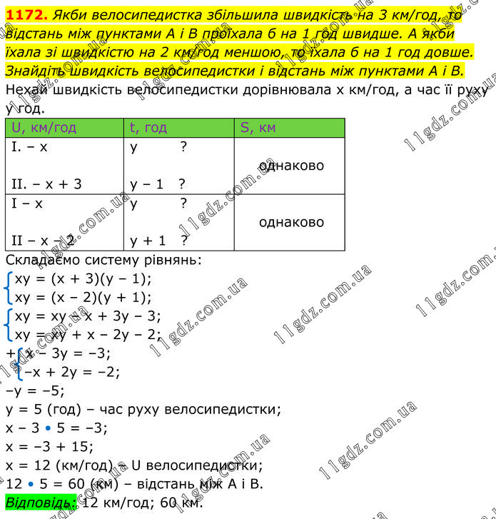 Якби велосипедистка збільшила швидкість на 3 км/год, то відстань між пунктами A і B проїхала б на 1 год швидше. А якби їхала зі швидкістю на 2 км/год меншою, то їхала б на 1 год довше. Знайдіть швидкість велосипедистки і відстань між пунктами A і B. Нехай швидкість велосипедистки дорівнювала х км/год, а час її руху у год. Складаємо систему рівнянь: ху = (х + 3)(у – 1); ху = (х – 2)(у + 1); ху = ху – х + 3у – 3; ху = ху + х – 2у – 2; + х – 3у = –3; –х + 2у = –2; –у = –5; у = 5 (год) – час руху велосипедистки; х – 3 • 5 = –3; х = –3 + 15; х = 12 (км/год) – U велосипедистки; 12 • 5 = 60 (км) – відстань між А і В. Відповідь: 12 км/год; 60 км.