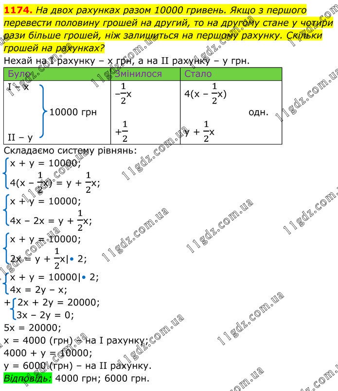 На двох рахунках разом 10000 гривень. Якщо з першого перевести половину грошей на другий, то на другому стане у чотири рази більше грошей, ніж залишиться на першому рахунку. Скільки грошей на рахунках? Нехай на І рахунку – х грн, а на ІІ рахунку – у грн. Складаємо систему рівнянь: х + у = 10000; 4(х – 1/2х) = у + 1/2х; х + у = 10000; 4х – 2х = у + 1/2х; х + у = 10000; 2х = у + 1/2х|• 2; x + y = 10000|• 2; 4x = 2y – x; + 2х + 2у = 20000; 3х – 2у = 0; 5х = 20000; х = 4000 (грн) – на І рахунку; 4000 + у = 10000; у = 6000 (грн) – на ІІ рахунку. Відповідь: 4000 грн; 6000 грн.