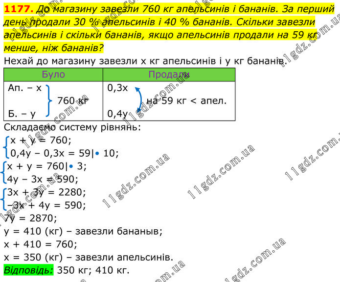 До магазину завезли 760 кг апельсинів і бананів. За перший день продали 30 % апельсинів і 40 % бананів. Скільки завезли апельсинів і скільки бананів, якщо апельсинів продали на 59 кг менше, ніж бананів? Нехай до магазину завезли х кг апельсинів і у кг бананів. Складаємо систему рівнянь: х + у = 760; 0,4у – 0,3х = 59|• 10; x + y = 760|• 3; 4y – 3x = 590; 3x + 3y = 2280; –3x + 4y = 590; 7y = 2870; y = 410 (кг) – завезли бананыв; х + 410 = 760; х = 350 (кг) – завезли апельсинів. Відповідь: 350 кг; 410 кг.