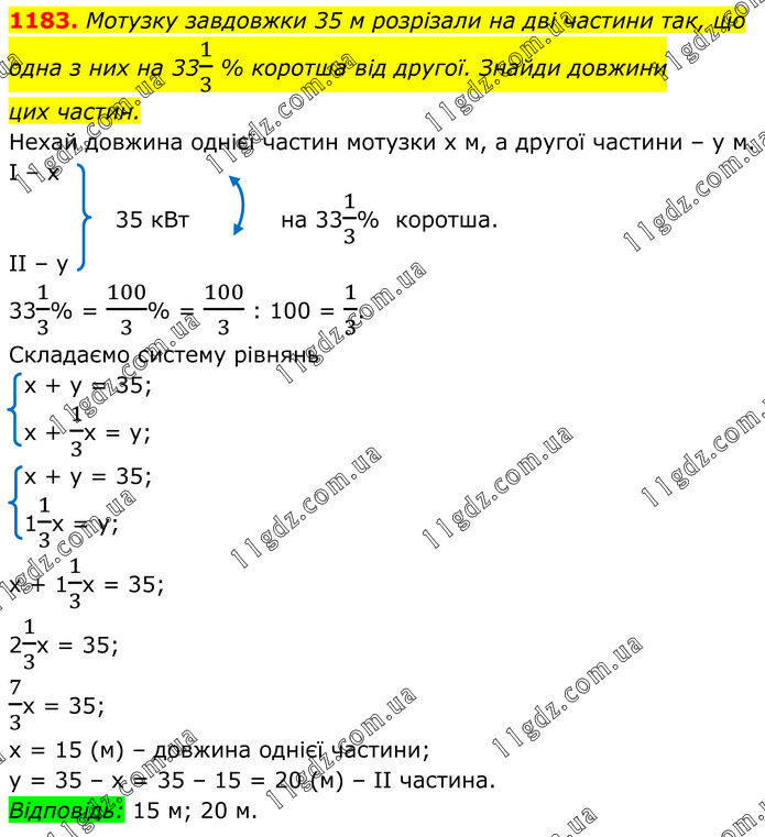 Мотузку завдовжки 35 м розрізали на дві частини так, що одна з них на 331/3 % коротша від другої. Знайди довжини цих частин. Нехай довжина однієї частин мотузки х м, а другої частини – у м. І – х 35 кВт на 331/3% коротша. ІІ – у 331/3% = 100/3% = 100/3 : 100 = 1/3. Складаємо систему рівнянь х + у = 35; х + 1/3х = у; х + у = 35; 11/3х = у; х + 11/3х = 35; 21/3х = 35; 7/3х = 35; х = 15 (м) – довжина однієї частини; у = 35 – х = 35 – 15 = 20 (м) – ІІ частина. Відповідь: 15 м; 20 м.