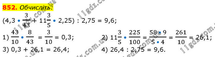 Обчисліть: (4,3 • 3/43 + 113/5 • 2,25) : 2,75 = 9,6; 1) 43/10 • 8/43 = 3/10 = 0,3; 3) 0,3 + 26,1 = 26,4; 2) 113/5 • 225/100 = (58 • 9)/(5 • 4) = 261/10 = 26,1; 4) 26,4 : 2,75 = 9,6.
