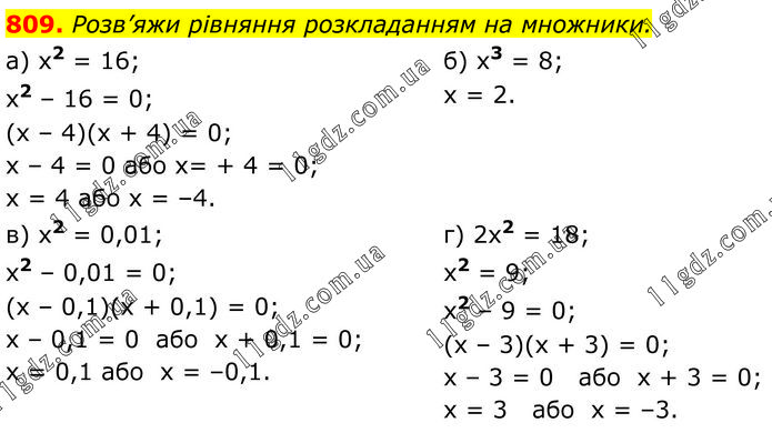 Розв’яжи рівняння розкладанням на множники. а) х2 = 16; х2 – 16 = 0; (х – 4)(х + 4) = 0; х – 4 = 0 або х= + 4 = 0; х = 4 або х = –4. б) х3 = 8; х = 2. в) х2 = 0,01; х2 – 0,01 = 0; (х – 0,1)(х + 0,1) = 0; х – 0,1 = 0 або х + 0,1 = 0; х = 0,1 або х = –0,1. г) 2х2 = 18; х2 = 9; х2 – 9 = 0; (х – 3)(х + 3) = 0; х – 3 = 0 або х + 3 = 0; х = 3 або х = –3.