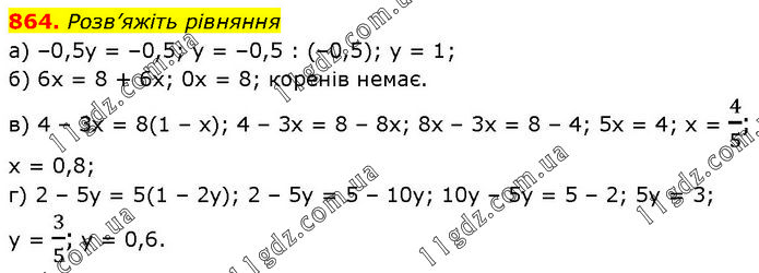 Розв’яжіть рівняння а) –0,5у = –0,5; у = –0,5 : (–0,5); у = 1; б) 6х = 8 + 6х; 0x = 8; коренів немає. в) 4 – 3x = 8(1 – x); 4 – 3x = 8 – 8x; 8x – 3x = 8 – 4; 5x = 4; x = 4/5; x = 0,8; г) 2 – 5y = 5(1 – 2y); 2 – 5y = 5 – 10y; 10y – 5y = 5 – 2; 5y = 3; y = 3/5; y = 0,6.