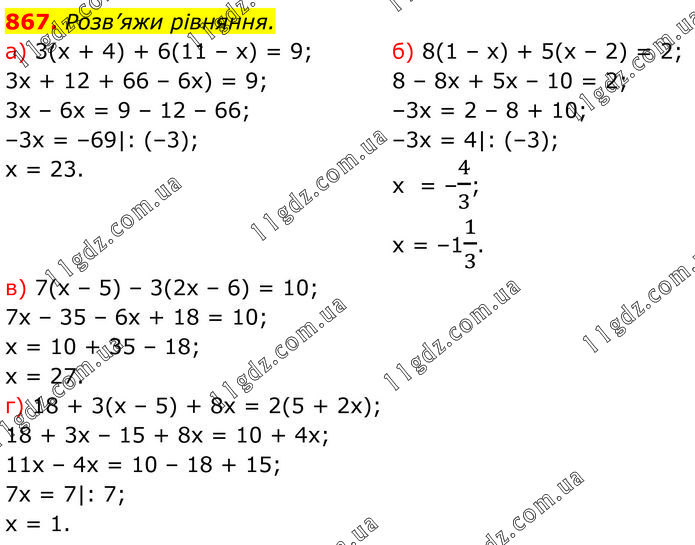 Розв’яжи рівняння. a) 3(x + 4) + 6(11 – x) = 9; 3x + 12 + 66 – 6x) = 9; 3x – 6x = 9 – 12 – 66; –3x = –69|: (–3); x = 23. б) 8(1 – x) + 5(x – 2) = 2; 8 – 8x + 5x – 10 = 2; –3x = 2 – 8 + 10; –3x = 4|: (–3); x = –4/3; x = –11/3. в) 7(x – 5) – 3(2x – 6) = 10; 7x – 35 – 6x + 18 = 10; x = 10 + 35 – 18; x = 27. г) 18 + 3(x – 5) + 8x = 2(5 + 2x); 18 + 3x – 15 + 8x = 10 + 4x; 11x – 4x = 10 – 18 + 15; 7x = 7|: 7; x = 1.