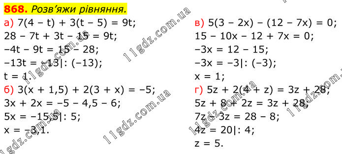 Розв’яжи рівняння. a) 7(4 – t) + 3(t – 5) = 9t; 28 – 7t + 3t – 15 = 9t; –4t – 9t = 15 – 28; –13t = –13|: (–13); t = 1. б) 3(x + 1,5) + 2(3 + x) = –5; 3x + 2x = –5 – 4,5 – 6; 5x = –15,5|: 5; x = –3,1. в) 5(3 – 2x) – (12 – 7x) = 0; 15 – 10x – 12 + 7x = 0; –3x = 12 – 15; –3x = –3|: (–3); x = 1; г) 5z + 2(4 + z) = 3z + 28; 5z + 8 + 2z = 3z + 28; 7z – 3z = 28 – 8; 4z = 20|: 4; z = 5.