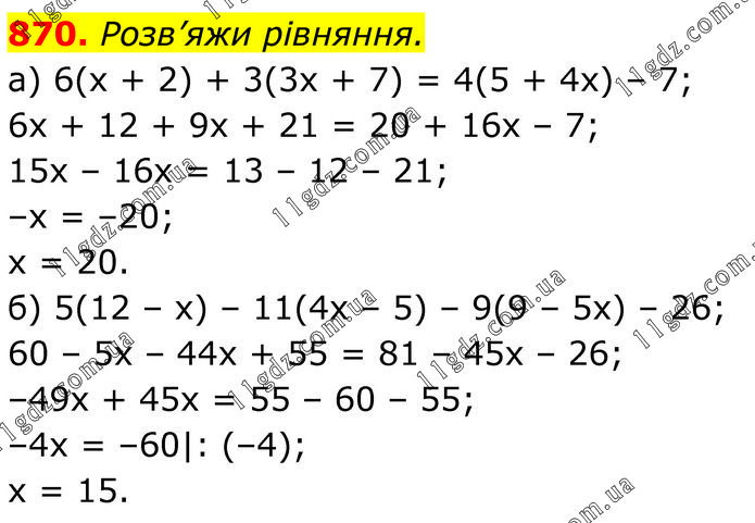 Розв’яжи рівняння. a) 6(x + 2) + 3(3x + 7) = 4(5 + 4x) – 7; 6x + 12 + 9x + 21 = 20 + 16x – 7; 15x – 16x = 13 – 12 – 21; –x = –20; x = 20. б) 5(12 – x) – 11(4x – 5) – 9(9 – 5x) – 26; 60 – 5x – 44x + 55 = 81 – 45x – 26; –49x + 45x = 55 – 60 – 55; –4x = –60|: (–4); x = 15.