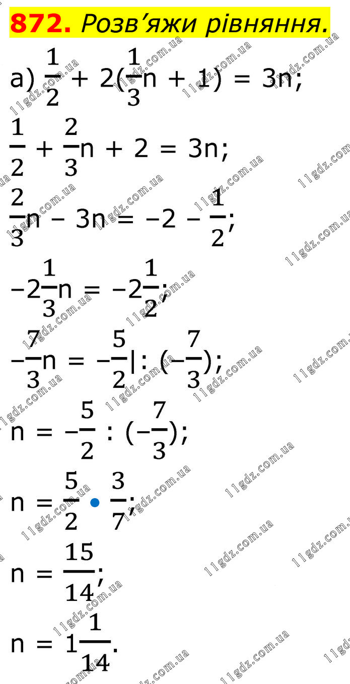 Розв’яжи рівняння. a) 1/2 + 2(1/3n + 1) = 3n; 1/2 + 2/3n + 2 = 3n; 2/3n – 3n = –2 – 1/2; –21/3n = –21/2; –7/3n = –5/2|: (–7/3); n = –5/2 : (–7/3); n = 5/2 • 3/7; n = 15/14; n = 11/14.