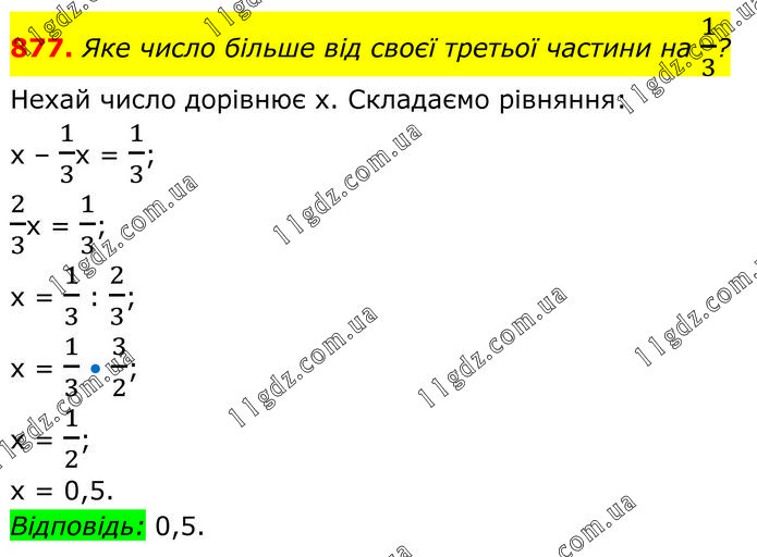 Яке число більше від своєї третьої частини на 1/3? Нехай число дорівнює х. Складаємо рівняння: х – 1/3х = 1/3; 2/3х = 1/3; x = 1/3 : 2/3; x = 1/3 • 3/2; x = 1/2; x = 0,5. Відповідь: 0,5.