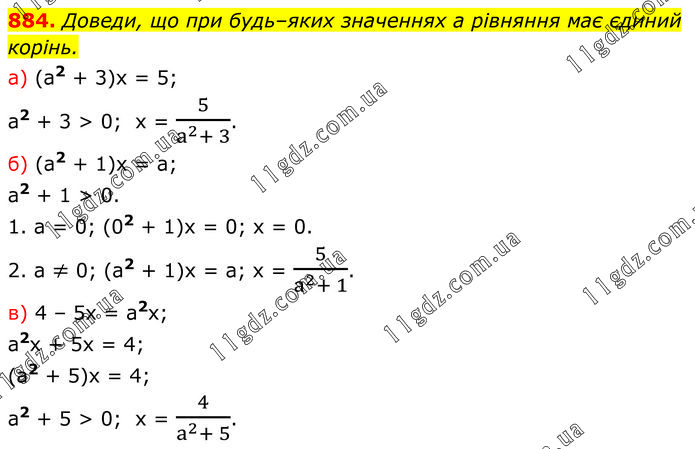 Доведи, що при будь–яких значеннях а рівняння має єдиний корінь. а) (а2 + 3)х = 5; а2 + 3 > 0; x = 5/(a^2+ 3). б) (a2 + 1)x = a; a2 + 1 > 0. 1. a = 0; (02 + 1)x = 0; x = 0. 2. a ≠ 0; (a2 + 1)x = a; x = 5/(a^2+ 1). в) 4 – 5x = a2x; a2x + 5x = 4; (a2 + 5)x = 4; a2 + 5 > 0; x = 4/(a^2+ 5).