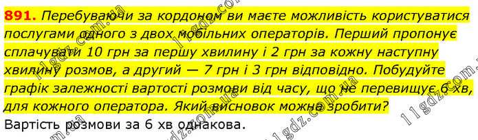 Перебуваючи за кордоном ви маєте можливість користуватися послугами одного з двох мобільних операторів. Перший пропонує сплачувати 10 грн за першу хвилину і 2 грн за кожну наступну хвилину розмов, а другий — 7 грн і 3 грн відповідно. Побудуйте графік залежності вартості розмови від часу, що не перевищує 6 хв, для кожного оператора. Який висновок можна зробити? Вартість розмови за 6 хв однакова.