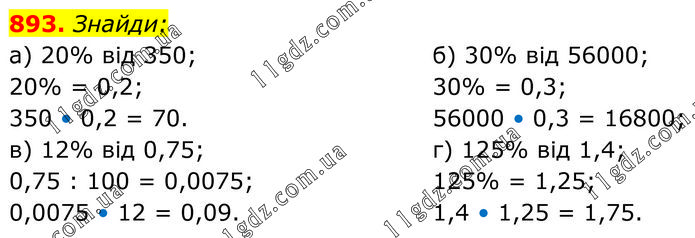 Знайди: а) 20% від 350; 20% = 0,2; 350 • 0,2 = 70. б) 30% від 56000; 30% = 0,3; 56000 • 0,3 = 16800; в) 12% від 0,75; 0,75 : 100 = 0,0075; 0,0075 • 12 = 0,09. г) 125% від 1,4; 125% = 1,25; 1,4 • 1,25 = 1,75.
