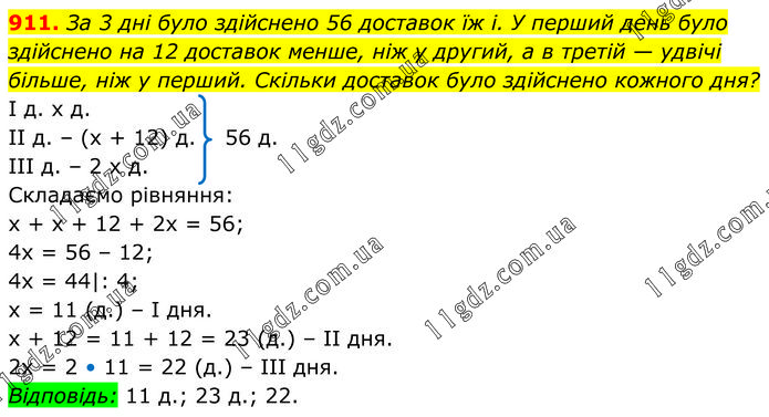 За 3 дні було здійснено 56 доставок їж і. У перший день було здійснено на 12 доставок менше, ніж у другий, а в третій — удвічі більше, ніж у перший. Скільки доставок було здійснено кожного дня? І д. х д. ІІ д. – (х + 12) д. 56 д. ІІІ д. – 2 х д. Складаємо рівняння: х + х + 12 + 2х = 56; 4х = 56 – 12; 4х = 44|: 4; х = 11 (д.) – І дня. х + 12 = 11 + 12 = 23 (д.) – ІІ дня. 2х = 2 • 11 = 22 (д.) – ІІІ дня. Відповідь: 11 д.; 23 д.; 22.