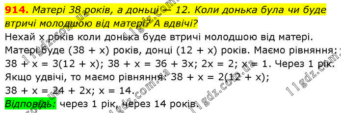 Матері 38 років, а доньці — 12. Коли донька була чи буде втричі молодшою від матері? А вдвічі? Нехай х років коли донька буде втричі молодшою від матері. Матері буде (38 + х) років, донці (12 + x) років. Маємо рівняння: 38 + х = 3(12 + х); 38 + х = 36 + Зх; 2х = 2; х = 1. Через 1 рік. Якщо удвічі, то маємо рівняння: 38 + х = 2(12 + х); 38 + х = 24 + 2х; х = 14. Відповідь: через 1 рік, через 14 років.