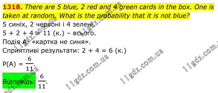 There are 5 blue, 2 red and 4 green cards in the box. One is taken at random. What is the probability that it is not blue? 5 синіх, 2 червоні і 4 зелені. 5 + 2 + 4 = 11 (к.) – всього. Подія А: «картка не синя». Сприятливі результати: 2 + 4 = 6 (к.) Р(А) = 6/11. Відповідь: 6/11.
