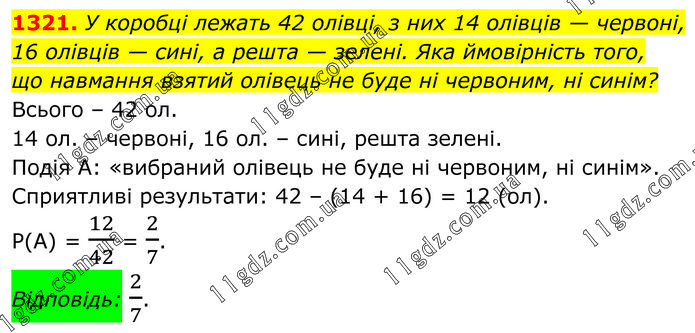У коробці лежать 42 олівці, з них 14 олівців — червоні, 16 олівців — сині, а решта — зелені. Яка ймовірність того, що навмання взятий олівець не буде ні червоним, ні синім? Всього – 42 ол. 14 ол. – червоні, 16 ол. – сині, решта зелені. Подія А: «вибраний олівець не буде ні червоним, ні синім». Сприятливі результати: 42 – (14 + 16) = 12 (ол). Р(А) = 12/42 = 2/7. Відповідь: 2/7.