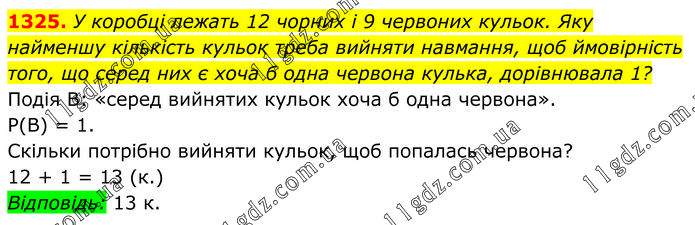 У коробці лежать 12 чорних і 9 червоних кульок. Яку найменшу кількість кульок треба вийняти навмання, щоб ймовірність того, що серед них є хоча б одна червона кулька, дорівнювала 1? Подія В: «серед вийнятих кульок хоча б одна червона». Р(В) = 1. Скільки потрібно вийняти кульок, щоб попалась червона? 12 + 1 = 13 (к.) Відповідь: 13 к.