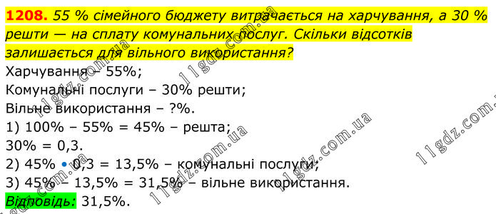 55 % сімейного бюджету витрачається на харчування, а 30 % решти — на сплату комунальних послуг. Скільки відсотків залишається для вільного використання? Харчування – 55%; Комунальні послуги – 30% решти; Вільне використання – ?%. 1) 100% – 55% = 45% – решта; 30% = 0,3. 2) 45% • 0,3 = 13,5% – комунальні послуги; 3) 45% – 13,5% = 31,5% – вільне використання. Відповідь: 31,5%.