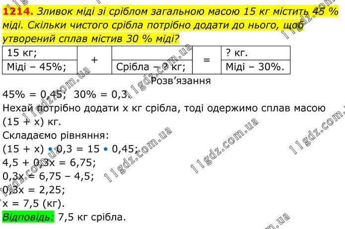 Зливок міді зі сріблом загальною масою 15 кг містить 45 % міді. Скільки чистого срібла потрібно додати до нього, щоб утворений сплав містив 30 % міді? 45% = 0,45; 30% = 0,3. Нехай потрібно додати х кг срібла, тоді одержимо сплав масою (15 + х) кг. Складаємо рівняння: (15 + х) • 0,3 = 15 • 0,45; 4,5 + 0,3х = 6,75; 0,3х = 6,75 – 4,5; 0,3х = 2,25; х = 7,5 (кг). Відповідь: 7,5 кг срібла.