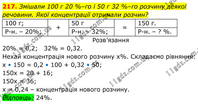 Змішали 100 г 20 %–го і 50 г 32 %–го розчину деякої речовини. Якої концентрації отримали розчин? 20% = 0,2; 32% = 0,32. Нехай концентрація нового розчину х%. Складаємо рівняння: х • 150 = 0,2 • 100 + 0,32 • 50; 150х = 20 + 16; 150х = 36; х = 0,24 – концентрація нового розчину. Відповідь: 24%.