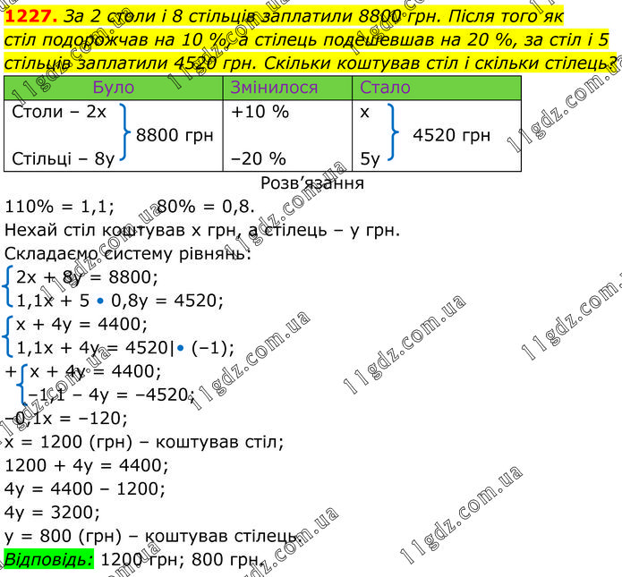 За 2 столи і 8 стільців заплатили 8800 грн. Після того як стіл подорожчав на 10 %, а стілець подешевшав на 20 %, за стіл і 5 стільців заплатили 4520 грн. Скільки коштував стіл і скільки стілець? 110% = 1,1; 80% = 0,8. Нехай стіл коштував х грн, а стілець – у грн. Складаємо систему рівнянь: 2х + 8у = 8800; 1,1х + 5 • 0,8у = 4520; х + 4у = 4400; 1,1х + 4у = 4520|• (–1); + х + 4у = 4400; –1,1 – 4у = –4520; –0,1х = –120; х = 1200 (грн) – коштував стіл; 1200 + 4у = 4400; 4у = 4400 – 1200; 4у = 3200; у = 800 (грн) – коштував стілець. Відповідь: 1200 грн; 800 грн.