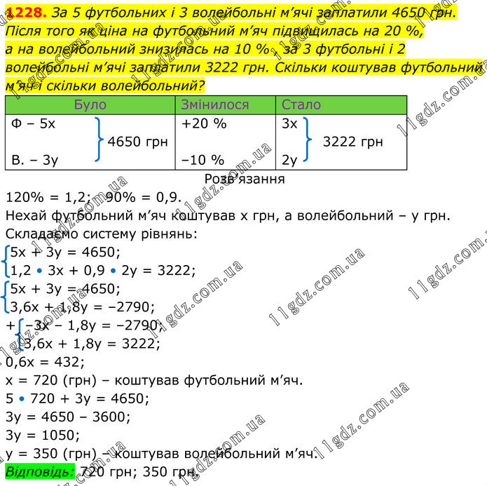За 5 футбольних і 3 волейбольні м’ячі заплатили 4650 грн. Після того як ціна на футбольний м’яч підвищилась на 20 %, а на волейбольний знизилась на 10 % , за 3 футбольні і 2 волейбольні м’ячі заплатили 3222 грн. Скільки коштував футбольний м’яч і скільки волейбольний? 120% = 1,2; 90% = 0,9. Нехай футбольний м’яч коштував х грн, а волейбольний – у грн. Складаємо систему рівнянь: 5х + 3у = 4650; 1,2 • 3х + 0,9 • 2у = 3222; 5х + 3у = 4650; 3,6х + 1,8у = –2790; + –3х – 1,8у = –2790; 3,6х + 1,8у = 3222; 0,6х = 432; х = 720 (грн) – коштував футбольний м’яч. 5 • 720 + 3у = 4650; 3у = 4650 – 3600; 3у = 1050; у = 350 (грн) – коштував волейбольний м’яч. Відповідь: 720 грн; 350 грн.