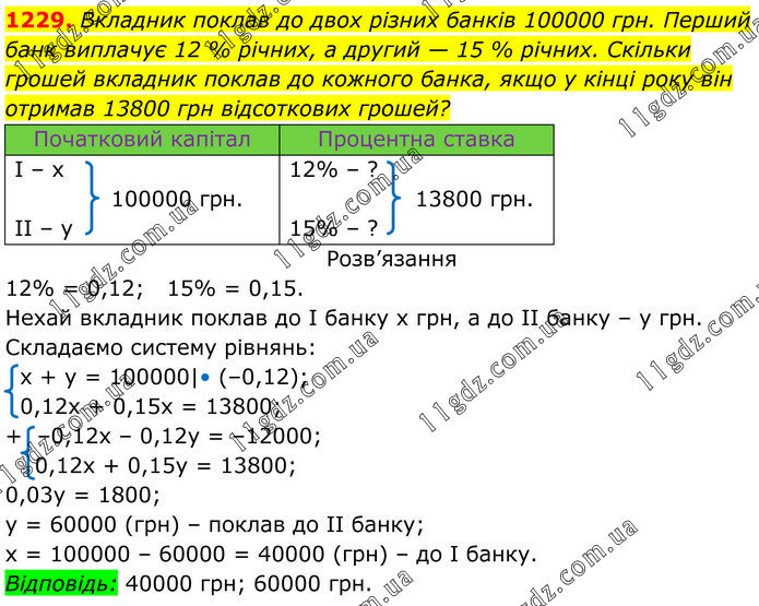 Вкладник поклав до двох різних банків 100000 грн. Перший банк виплачує 12 % річних, а другий — 15 % річних. Скільки грошей вкладник поклав до кожного банка, якщо у кінці року він отримав 13800 грн відсоткових грошей? 12% = 0,12; 15% = 0,15. Нехай вкладник поклав до І банку х грн, а до ІІ банку – у грн. Складаємо систему рівнянь: х + у = 100000|• (–0,12); 0,12х + 0,15х = 13800; + –0,12х – 0,12у = –12000; 0,12х + 0,15у = 13800; 0,03у = 1800; у = 60000 (грн) – поклав до ІІ банку; х = 100000 – 60000 = 40000 (грн) – до І банку. Відповідь: 40000 грн; 60000 грн.