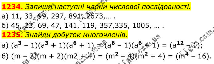 1234. Запиши наступні члени числової послідовності. а) 11, 33, 99, 297, 891, 2673,… . б) 45, 23, 69, 47, 141, 119, 357,335, 1005, … . 1235. Знайди добуток многочленів. а) (a3 – 1)(a3 + 1)(a6 + 1) = (a6 – 1)(a6 + 1) = (a12 – 1); б) (m – 2)(m + 2)(m2 + 4) = (m2 – 4)(m2 + 4) = (m4 – 16).