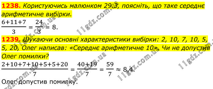 1238. Користуючись малюнком 29.3, поясніть, що таке середнє арифметичне вибірки. (6+11+7)/3 = 24/3 = 8. 1239. Шукаючи основні характеристики вибірки: 2, 10, 7, 10, 5, 5, 20, Олег написав: «Середнє арифметичне 10». Чи не допустив Олег помилки? (2+10+7+10+5+5+20)/7 = (40+19)/7 = 59/7 ≈ 8,4. Олег допустив помилку.