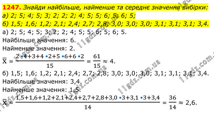 Знайди найбільше, найменше та середнє значення вибірки: а) 2; 5; 4; 5; 3; 2; 2; 2; 4; 5; 5; 6; 5; 6; 5; б) 1,5; 1,6; 1,2; 2,1; 2,4; 2,7; 2,8; 3,0; 3,0; 3,0; 3,1; 3,1; 3,1; 3,4. а) 2; 5; 4; 5; 3; 2; 2; 4; 5; 5; 6; 5; 6; 5. Найбільше значення: 6. Найменше значення: 2. х ̅ = (2 •4+3+4 •2+5 •6+6 •2)/15 = 61/15 ≈ 4. б) 1,5; 1,6; 1,2; 2,1; 2,4; 2,7; 2,8; 3,0; 3,0; 3,0; 3,1; 3,1; 3,1; 3,4. Найбільше значення: 3,4. Найменше значення: 1,5. х ̅ = (1,5+1,6+1,2+2,1+2,4+2,7+2,8+3,0 •3+3,1 •3+3,4)/14 = 36/14 ≈ 2,6.