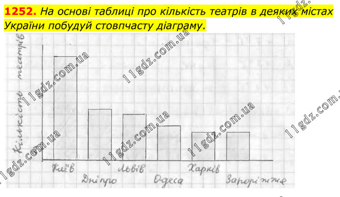 На основі таблиці про кількість театрів в деяких містах України побудуй стовпчасту діаграму.