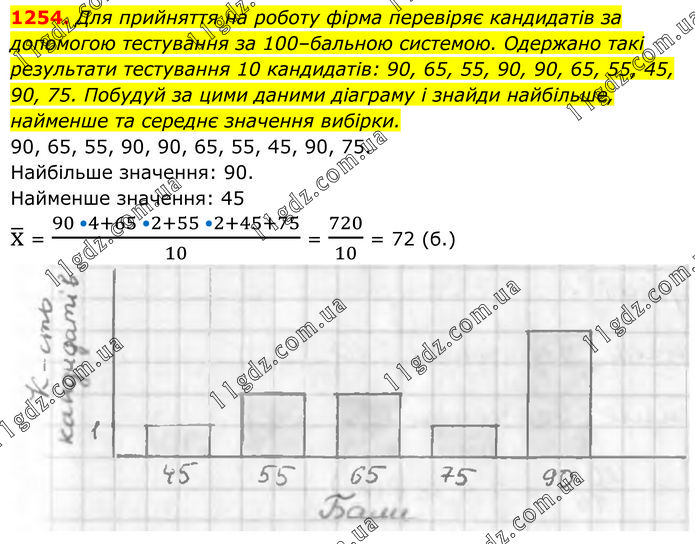 Для прийняття на роботу фірма перевіряє кандидатів за допомогою тестування за 100–бальною системою. Одержано такі результати тестування 10 кандидатів: 90, 65, 55, 90, 90, 65, 55, 45, 90, 75. Побудуй за цими даними діаграму і знайди найбільше, найменше та середнє значення вибірки. 90, 65, 55, 90, 90, 65, 55, 45, 90, 75. Найбільше значення: 90. Найменше значення: 45 х ̅ = (90 •4+65 •2+55 •2+45+75)/10 = 720/10 = 72 (б.)