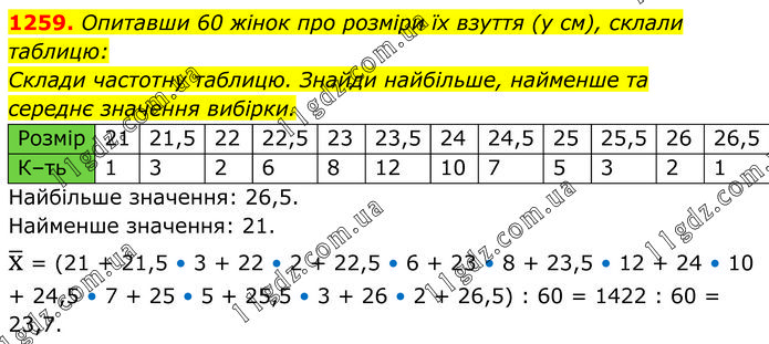Опитавши 60 жінок про розміри їх взуття (у см), склали таблицю: Склади частотну таблицю. Знайди найбільше, найменше та середнє значення вибірки. Найбільше значення: 26,5. Найменше значення: 21. х ̅ = (21 + 21,5 • 3 + 22 • 2 + 22,5 • 6 + 23 • 8 + 23,5 • 12 + 24 • 10 + 24,5 • 7 + 25 • 5 + 25,5 • 3 + 26 • 2 + 26,5) : 60 = 1422 : 60 = 23,7.