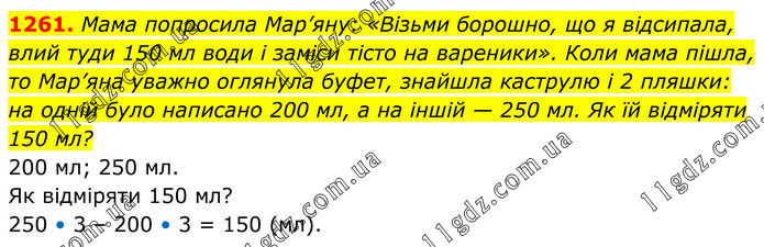 Мама попросила Мар’яну: «Візьми борошно, що я відсипала, влий туди 150 мл води і заміси тісто на вареники». Коли мама пішла, то Мар’яна уважно оглянула буфет, знайшла каструлю і 2 пляшки: на одній було написано 200 мл, а на іншій — 250 мл. Як їй відміряти 150 мл? 200 мл; 250 мл. Як відміряти 150 мл? 250 • 3 – 200 • 3 = 150 (мл).