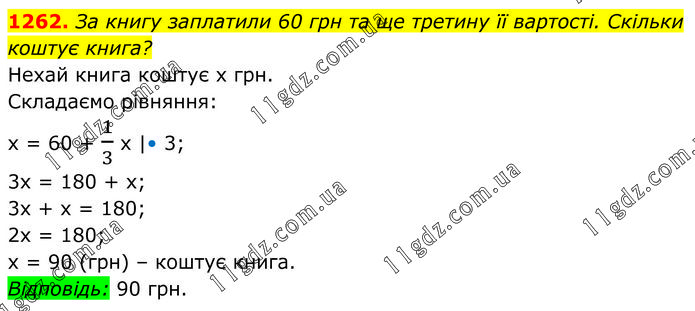 За книгу заплатили 60 грн та ще третину її вартості. Скільки коштує книга? Нехай книга коштує х грн. Складаємо рівняння: х = 60 + 1/3 х |• 3; 3х = 180 + х; 3х + х = 180; 2х = 180; х = 90 (грн) – коштує книга. Відповідь: 90 грн.