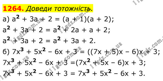 Доведи тотожність. а) а2 + 3а + 2 = (а + 1)(а + 2); а2 + 3а + 2 = а2 + 2а + а + 2; а2 + 3а + 2 = а2 + 3а + 2. б) 7х3 + 5х2 – 6х + 3 = ((7х + 5)х – 6)х + 3; 7х3 + 5х2 – 6х + 3 =(7х2 + 5х – 6)х + 3; 7x3 + 5x2 – 6x + 3 = 7x3 + 5x2 – 6x + 3.