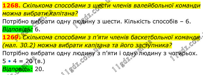 1268. Скількома способами з шести членів валейбольної команди можна вибрати капітана? Потрібно вибрати одну людину з шести. Кількість способів – 6. Відповідь: 6. 1269. Скількома способами з п’яти членів баскетбольної команди (мал. 30.2) можна вибрати капітана та його заступника? Потрібно вибрати одну людину з п’яти і одну людину з чотирьох. 5 • 4 = 20 (в.) Відповідь: 20.