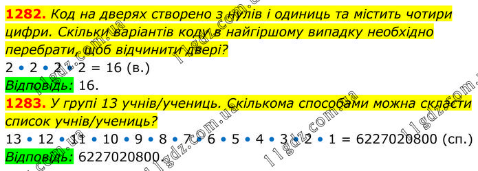 1282. Код на дверях створено з нулів і одиниць та містить чотири цифри. Скільки варіантів коду в найгіршому випадку необхідно перебрати, щоб відчинити двері? 2 • 2 • 2 • 2 = 16 (в.) Відповідь: 16. 1283. У групі 13 учнів/учениць. Скількома способами можна скласти список учнів/учениць? 13 • 12 • 11 • 10 • 9 • 8 • 7 • 6 • 5 • 4 • 3 • 2 • 1 = 6227020800 (сп.) Відповідь: 6227020800.
