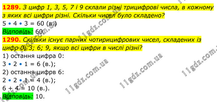1289. З цифр 1, 3, 5, 7 і 9 склали різні трицифрові числа, в кожному з яких всі цифри різні. Скільки чисел було складено? 5 • 4 • 3 = 60 (в.) Відповідь: 60. 1290. Скільки існує парних чотирицифрових чисел, складених із цифр 0; 3; 6; 9, якщо всі цифри в числі різні? 1) остання цифра 0: 3 • 2 • 1 = 6 (в.); 2) остання цифрв 6: 2 • 2 • 1 = 4 (в.); 6 + 4 = 10 (в.). Відповідь: 10.