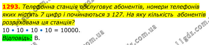 Телефонна станція обслуговує абонентів, номери телефонів яких містять 7 цифр і починаються з 127. На яку кількість абонентів розрахована ця станція? 10 • 10 • 10 • 10 = 10000. Відповідь: В.