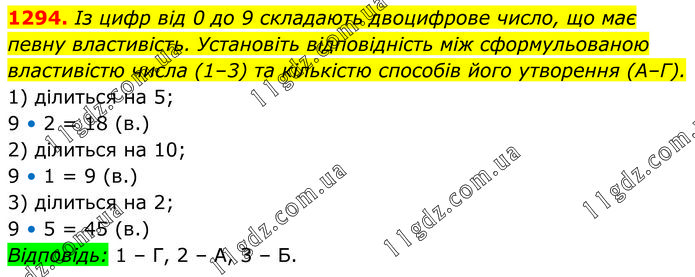 Із цифр від 0 до 9 складають двоцифрове число, що має певну властивість. Установіть відповідність між сформульованою властивістю числа (1–3) та кількістю способів його утворення (А–Г). 1) ділиться на 5; 9 • 2 = 18 (в.) 2) ділиться на 10; 9 • 1 = 9 (в.) 3) ділиться на 2; 9 • 5 = 45 (в.) Відповідь: 1 – Г, 2 – А, 3 – Б.