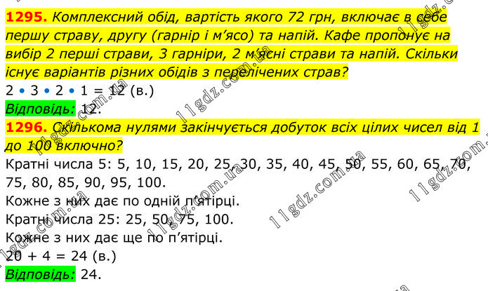 1295. Комплексний обід, вартість якого 72 грн, включає в себе першу страву, другу (гарнір і м’ясо) та напій. Кафе пропонує на вибір 2 перші страви, 3 гарніри, 2 м’ясні страви та напій. Скільки існує варіантів різних обідів з перелічених страв? 2 • 3 • 2 • 1 = 12 (в.) Відповідь: 12. 1296. Скількома нулями закінчується добуток всіх цілих чисел від 1 до 100 включно? Кратні числа 5: 5, 10, 15, 20, 25, 30, 35, 40, 45, 50, 55, 60, 65, 70, 75, 80, 85, 90, 95, 100. Кожне з них дає по одній п’ятірці. Кратні числа 25: 25, 50, 75, 100. Кожне з них дає ще по п’ятірці. 20 + 4 = 24 (в.) Відповідь: 24.