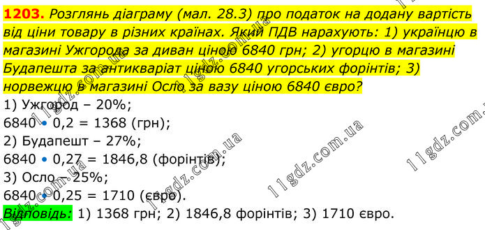 Розглянь діаграму (мал. 28.3) про податок на додану вартість від ціни товару в різних країнах. Який ПДВ нарахують: 1) українцю в магазині Ужгорода за диван ціною 6840 грн; 2) угорцю в магазині Будапешта за антикваріат ціною 6840 угорських форінтів; 3) норвежцю в магазині Осло за вазу ціною 6840 євро? 1) Ужгород – 20%; 6840 • 0,2 = 1368 (грн); 2) Будапешт – 27%; 6840 • 0,27 = 1846,8 (форінтів); 3) Осло – 25%; 6840 • 0,25 = 1710 (євро). Відповідь: 1) 1368 грн; 2) 1846,8 форінтів; 3) 1710 євро.