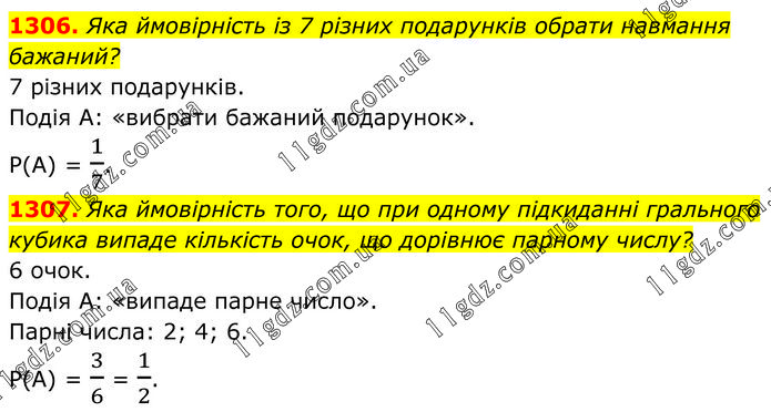 1306. Яка ймовірність із 7 різних подарунків обрати навмання бажаний? 7 різних подарунків. Подія А: «вибрати бажаний подарунок». Р(А) = 1/7. 1307. Яка ймовірність того, що при одному підкиданні грального кубика випаде кількість очок, що дорівнює парному числу? 6 очок. Подія А: «випаде парне число». Парні числа: 2; 4; 6. Р(А) = 3/6 = 1/2.