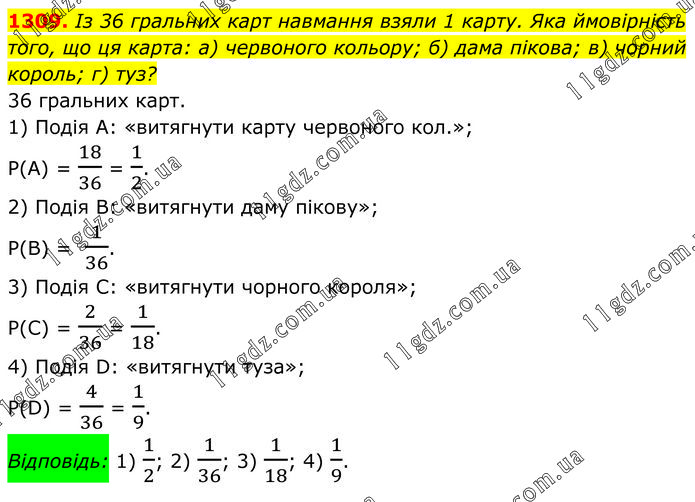 Із 36 гральних карт навмання взяли 1 карту. Яка ймовірність того, що ця карта: а) червоного кольору; б) дама пікова; в) чорний король; г) туз? 36 гральних карт. 1) Подія А: «витягнути карту червоного кол.»; Р(А) = 18/36 = 1/2. 2) Подія В: «витягнути даму пікову»; Р(В) = 1/36. 3) Подія С: «витягнути чорного короля»; Р(С) = 2/36 = 1/18. 4) Подія D: «витягнути туза»; Р(D) = 4/36 = 1/9. Відповідь: 1) 1/2; 2) 1/36; 3) 1/18; 4) 1/9.