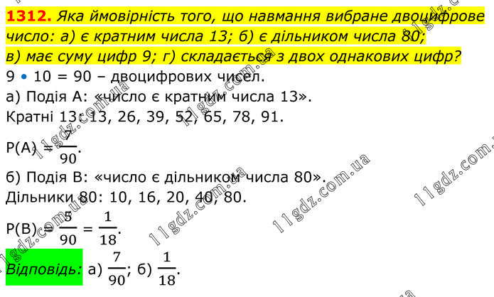 Яка ймовірність того, що навмання вибране двоцифрове число: а) є кратним числа 13; б) є дільником числа 80; в) має суму цифр 9; г) складається з двох однакових цифр? 9 • 10 = 90 – двоцифрових чисел. а) Подія А: «число є кратним числа 13». Кратні 13: 13, 26, 39, 52, 65, 78, 91. Р(А) = 7/90. б) Подія В: «число є дільником числа 80». Дільники 80: 10, 16, 20, 40, 80. Р(В) = 5/90 = 1/18. Відповідь: а) 7/90; б) 1/18.